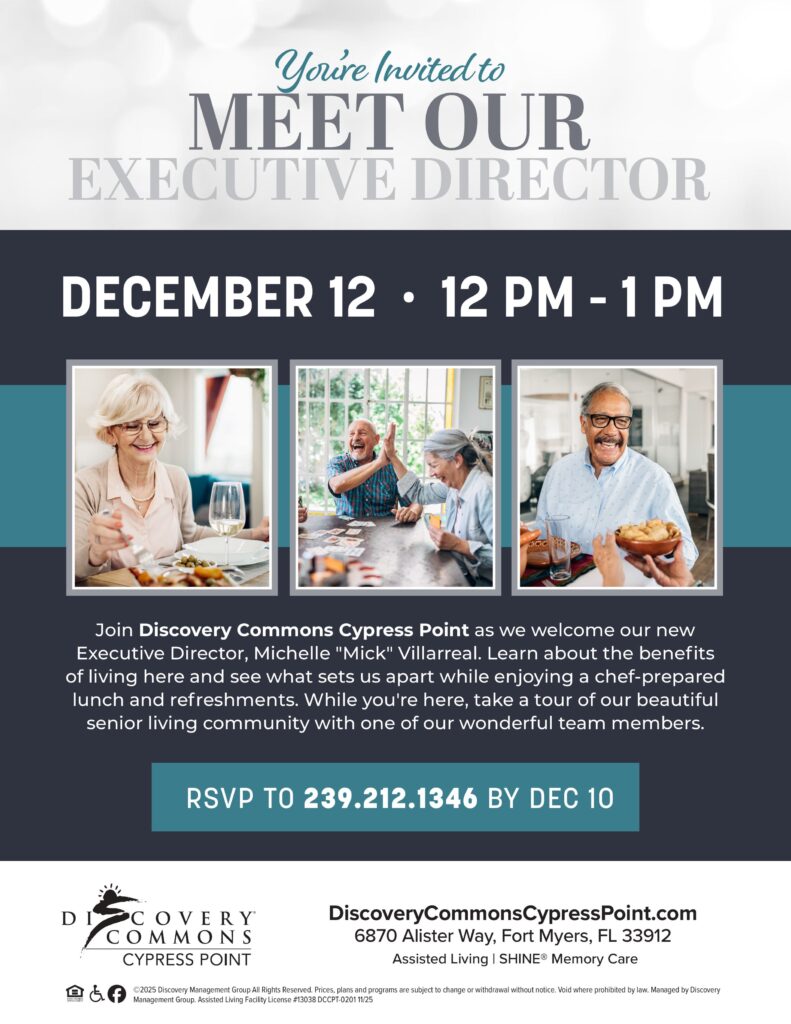 Join Discovery Commons Cypress Point as we welcome our new Executive Director, Michelle “Mick” Villarreal, Learn more about the benefits of living here and see what sets us apart while enjoying a chef-prepared lunch and refreshments. While you’re here, take a tour of our beautiful senior living community with one of our wonderful team members.